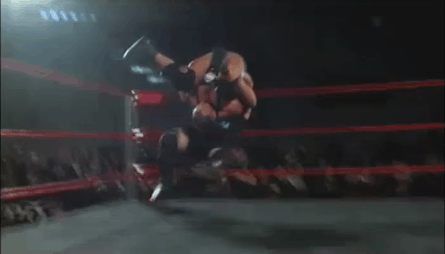 Patrick: Okay…how are you the good guy when you’re trying to molest the bad guy’s girl? Stupidity aside, this match wasn’t as good as it should’ve been, which sucks, but you could put that on Mondo breaking his leg taking the dive off the top of the entrance way. What they COULD pull off was good. Just sad to see what could’ve been (**½)